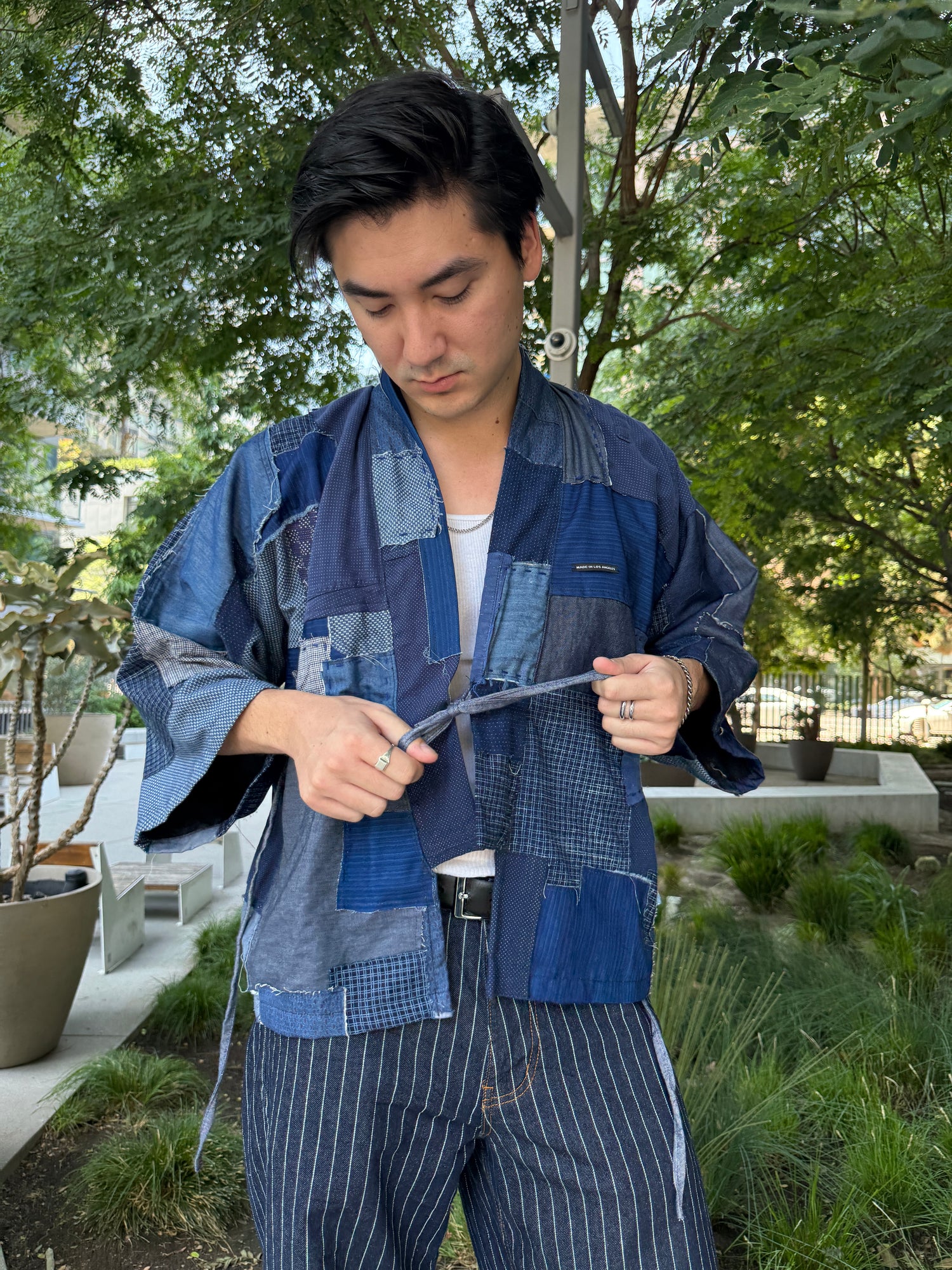 Striped Tie Shirt Kimono - Unisex blue striped wrap - Patchwork cotton - Made in LA